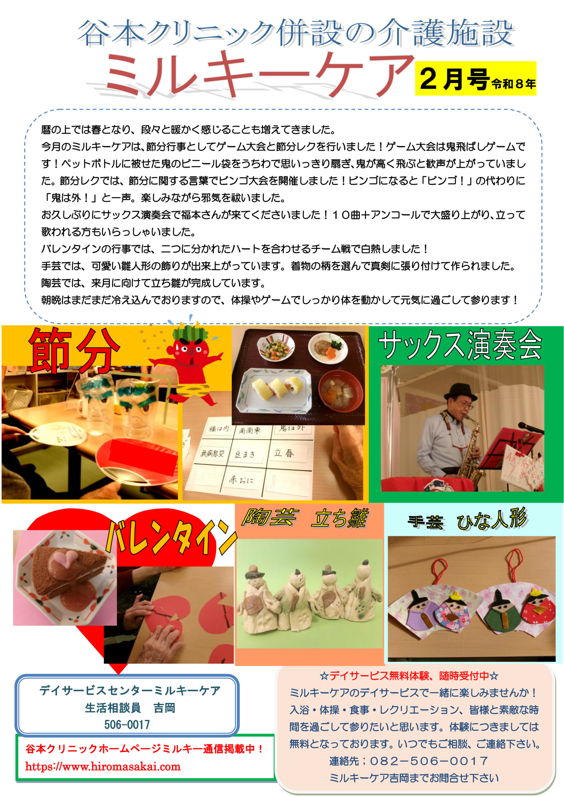 お花見や盆踊り、秋祭りにクリスマス会などの季節ごとの行事はもちろんのこと、お茶会にケーキバイキング、書道教室や陶芸教室、料理教室やカラオケなど、イベントが盛りだくさんです。その他にもボランティアの方々による大正琴やフラダンス似顔絵などもしており、地域の方々とも交流をさせていただいております。
